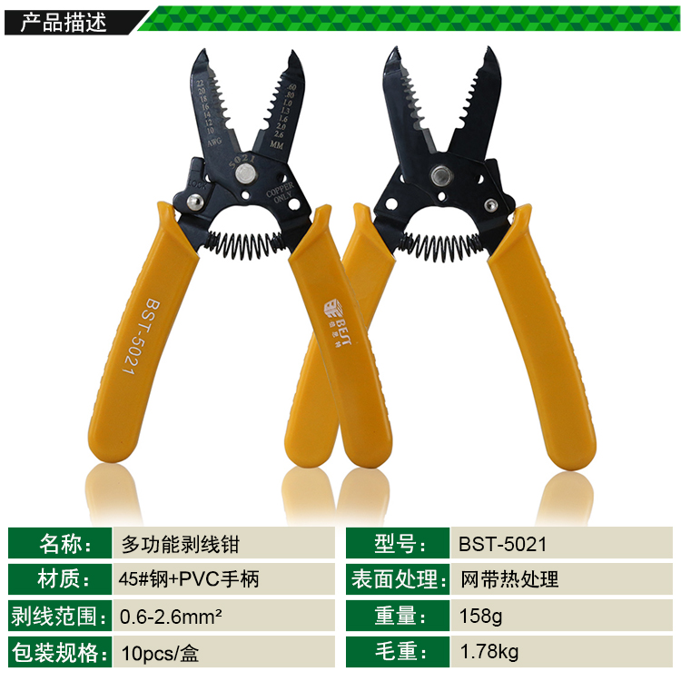 ? 產(chǎn)品名稱(chēng): 剝線鉗 電線鉗 多功能剝線鉗? 產(chǎn)品型號(hào): BST-5021? 產(chǎn)品類(lèi)別: 鉗子系列