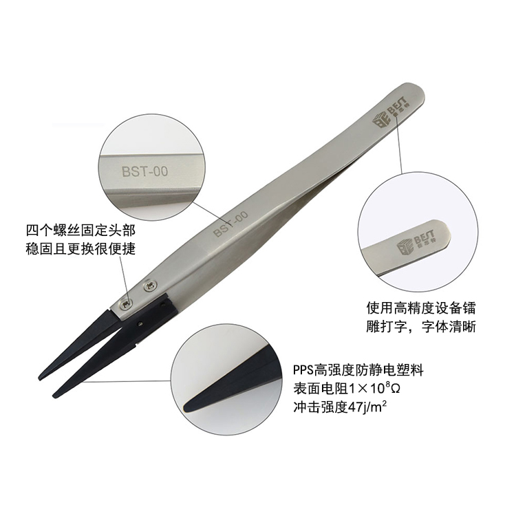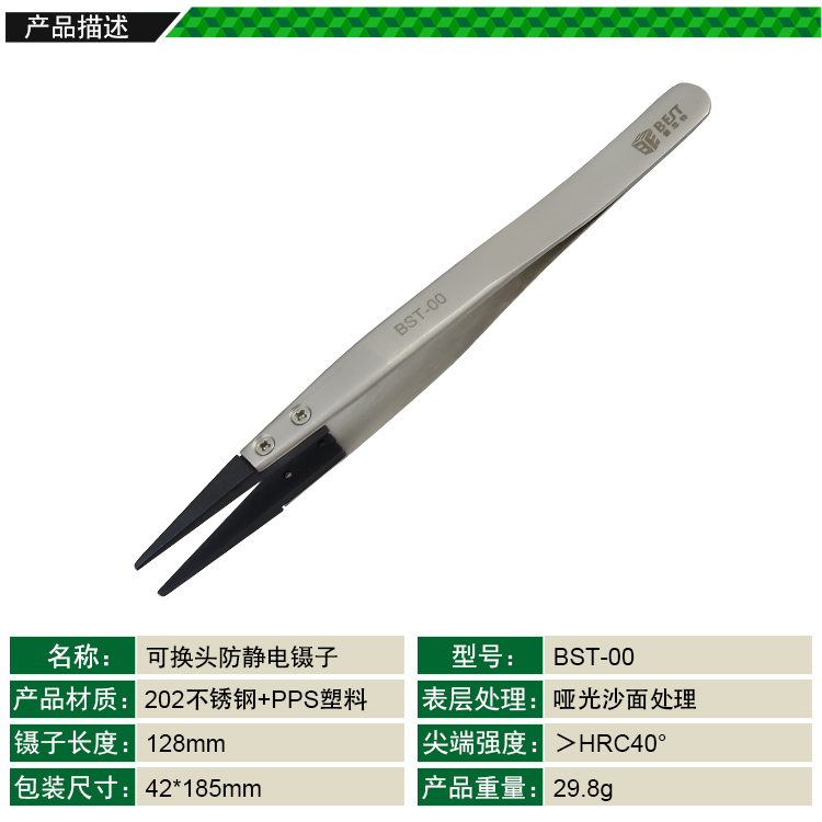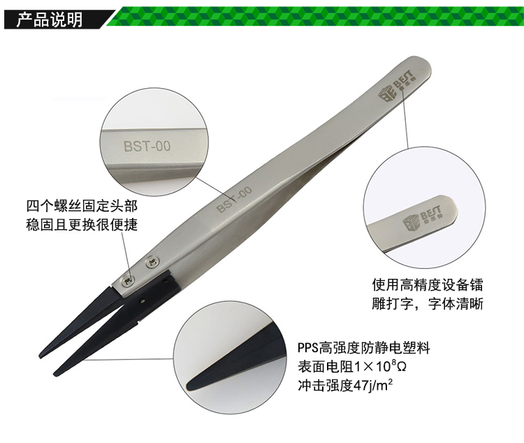 ? 產(chǎn)品名稱(chēng): 防靜電鑷子可換頭? 產(chǎn)品型號(hào): BST-00? 產(chǎn)品類(lèi)別: 鑷子系列