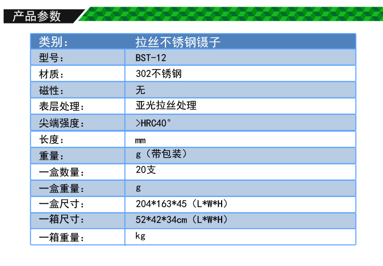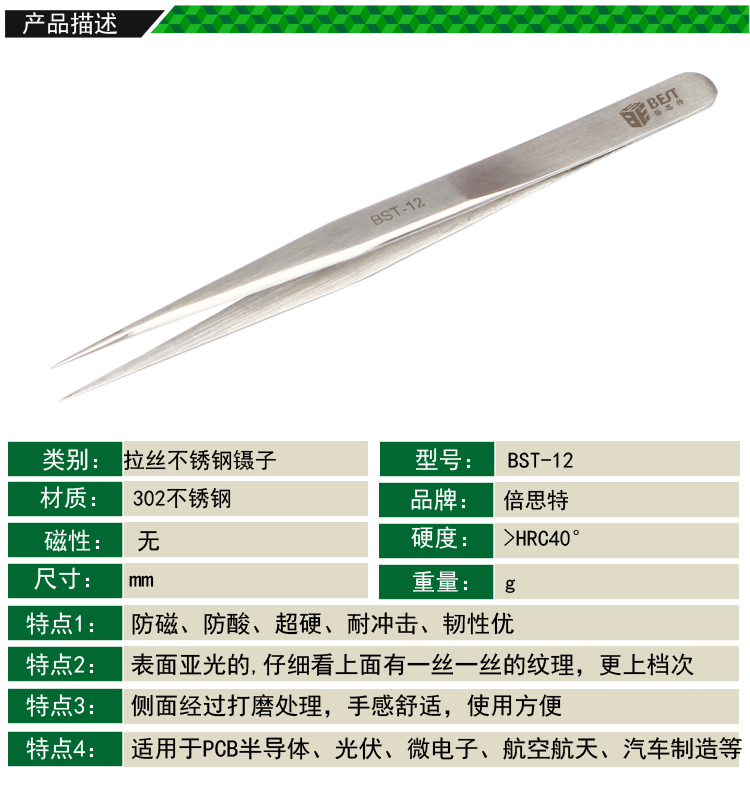 ? 產(chǎn)品名稱: 金屬拉絲鑷子 不銹鋼鑷子? 產(chǎn)品型號(hào): BST-12? 產(chǎn)品類別: 鑷子系列