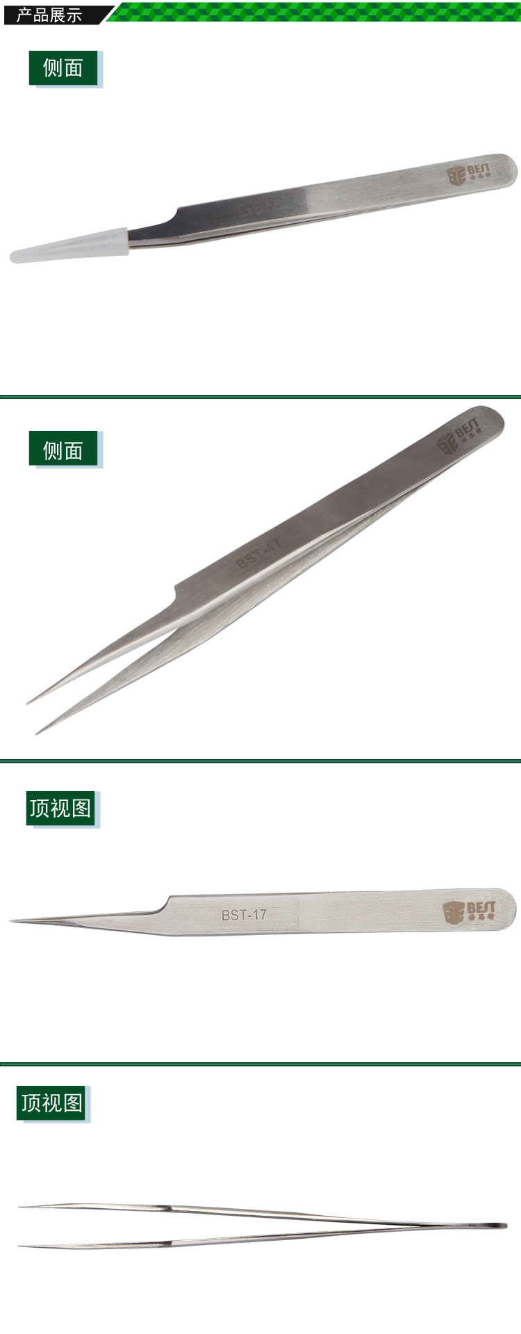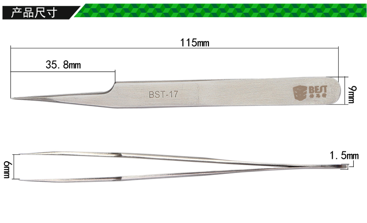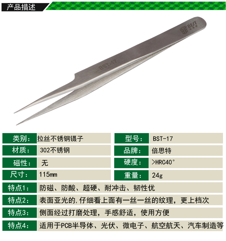 ? 產品名稱: 金屬拉絲鑷子 不銹鋼鑷子? 產品型號: BST-17? 產品類別: 鑷子系列