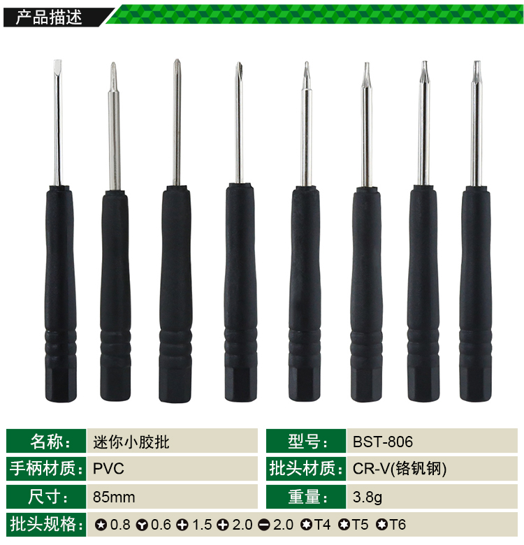 ? 產(chǎn)品名稱: 螺絲批 袖珍膠批? 產(chǎn)品型號: BST-806? 產(chǎn)品類別: 螺絲批系列