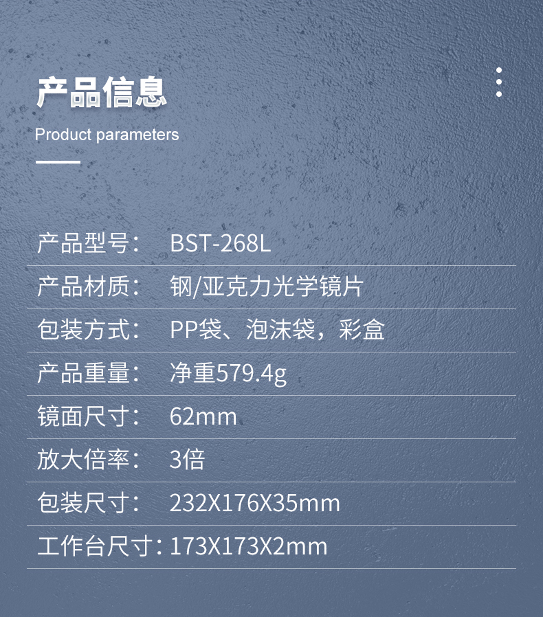 ? 產(chǎn)品名稱: 維修焊接臺式放大鏡? 產(chǎn)品型號: BST-268L? 產(chǎn)品類別: 臺燈放大鏡系列