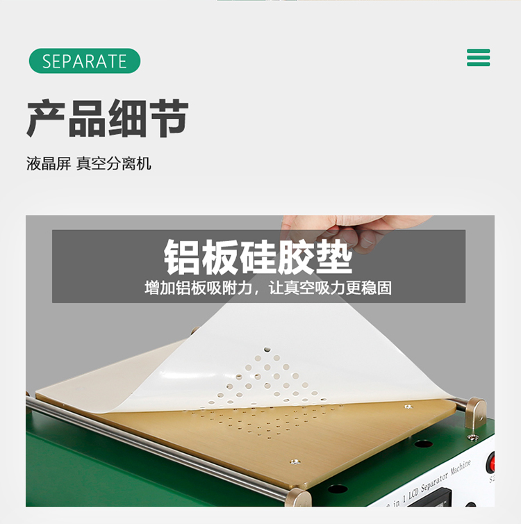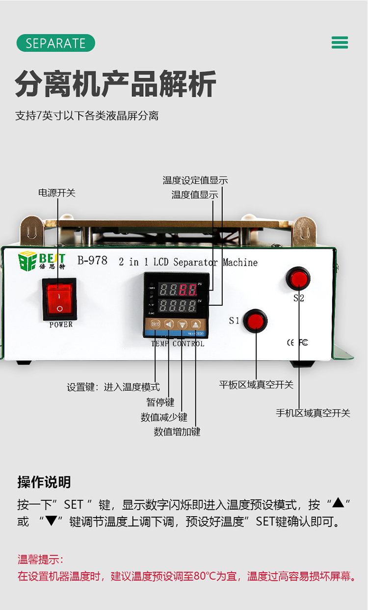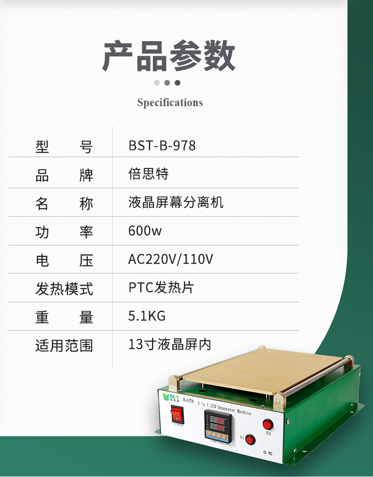 ? 產(chǎn)品名稱(chēng): 液晶屏分離機(jī) 真空拆屏機(jī)? 產(chǎn)品型號(hào): BST-B-978? 產(chǎn)品類(lèi)別: 分離機(jī)系列